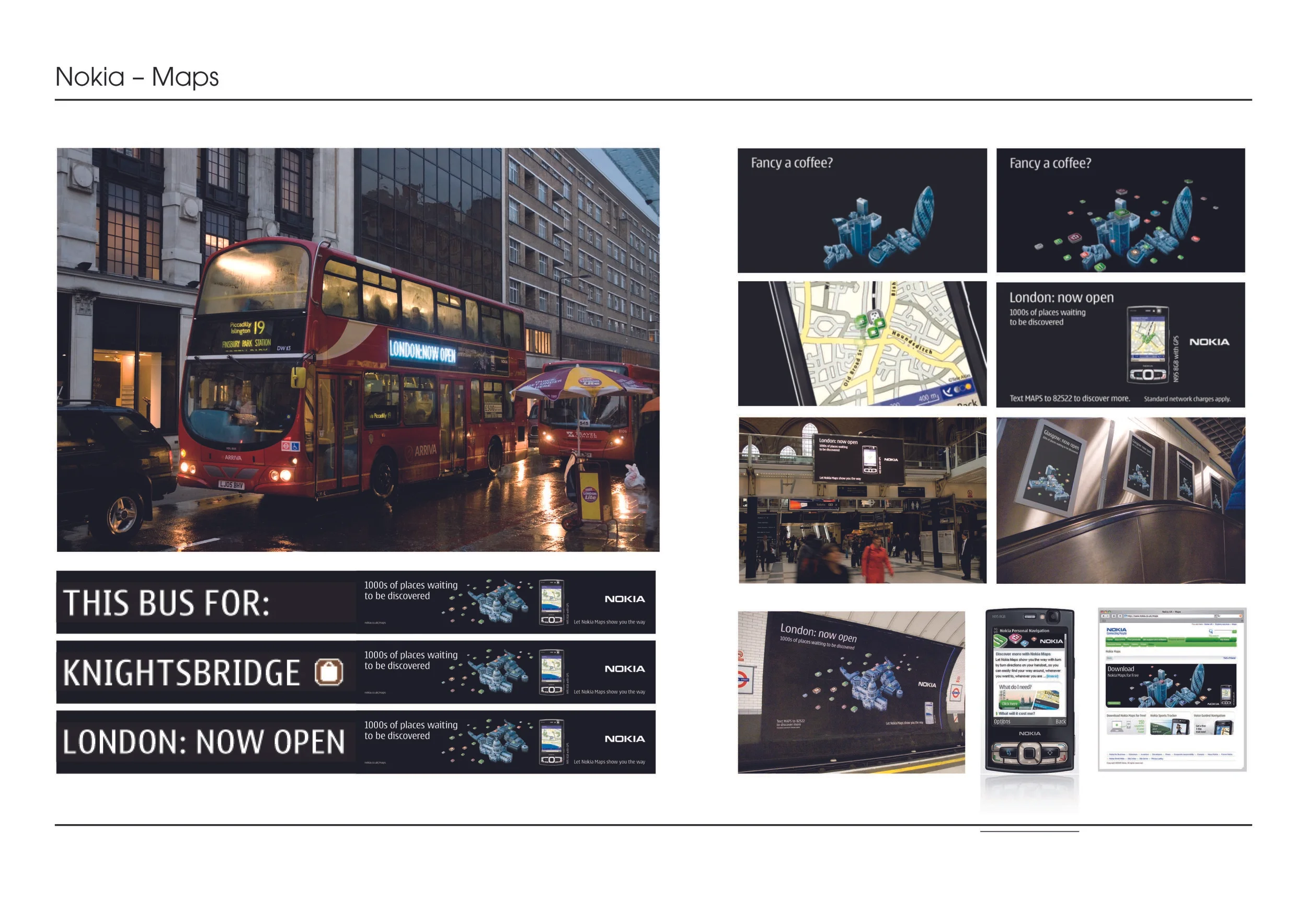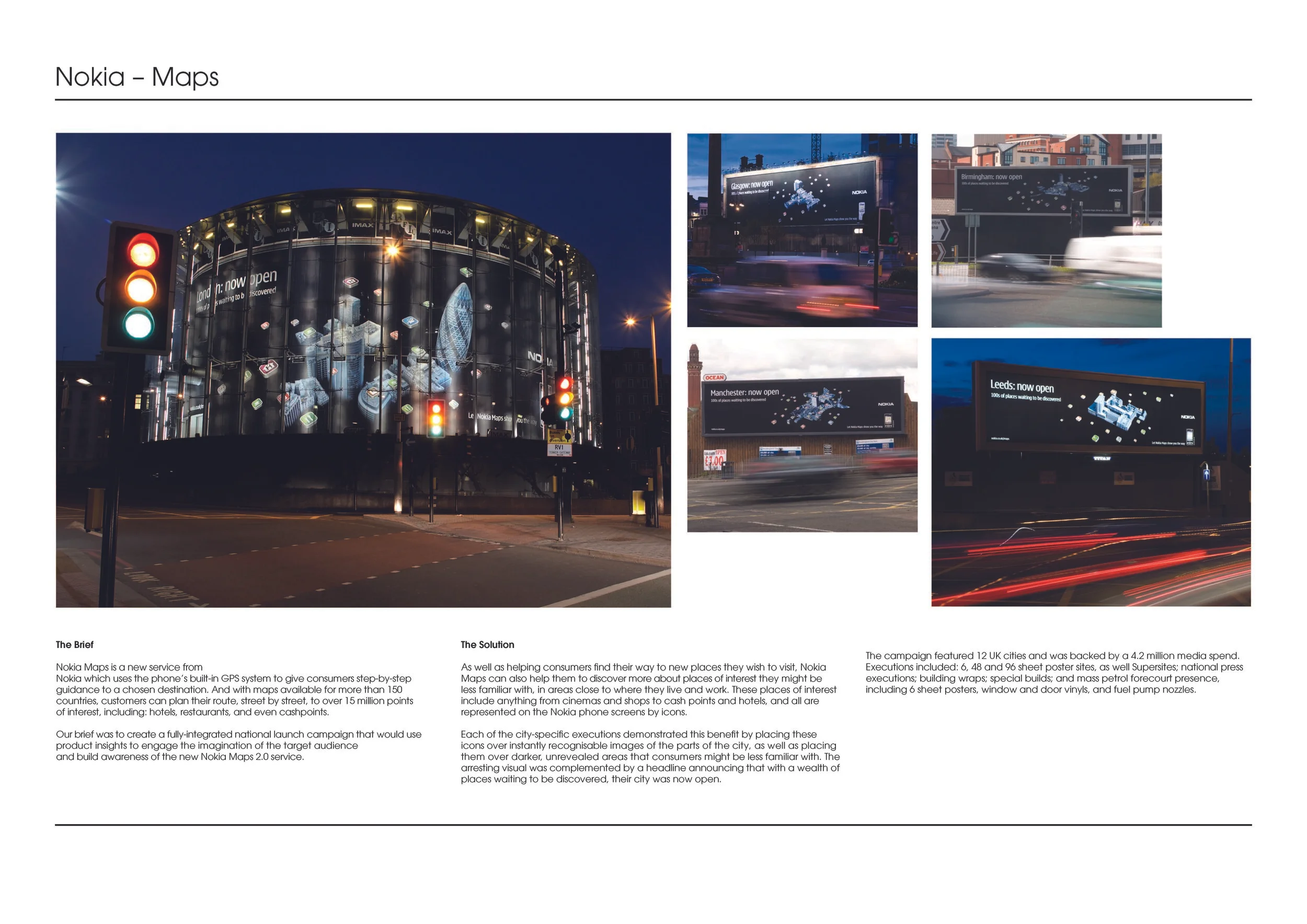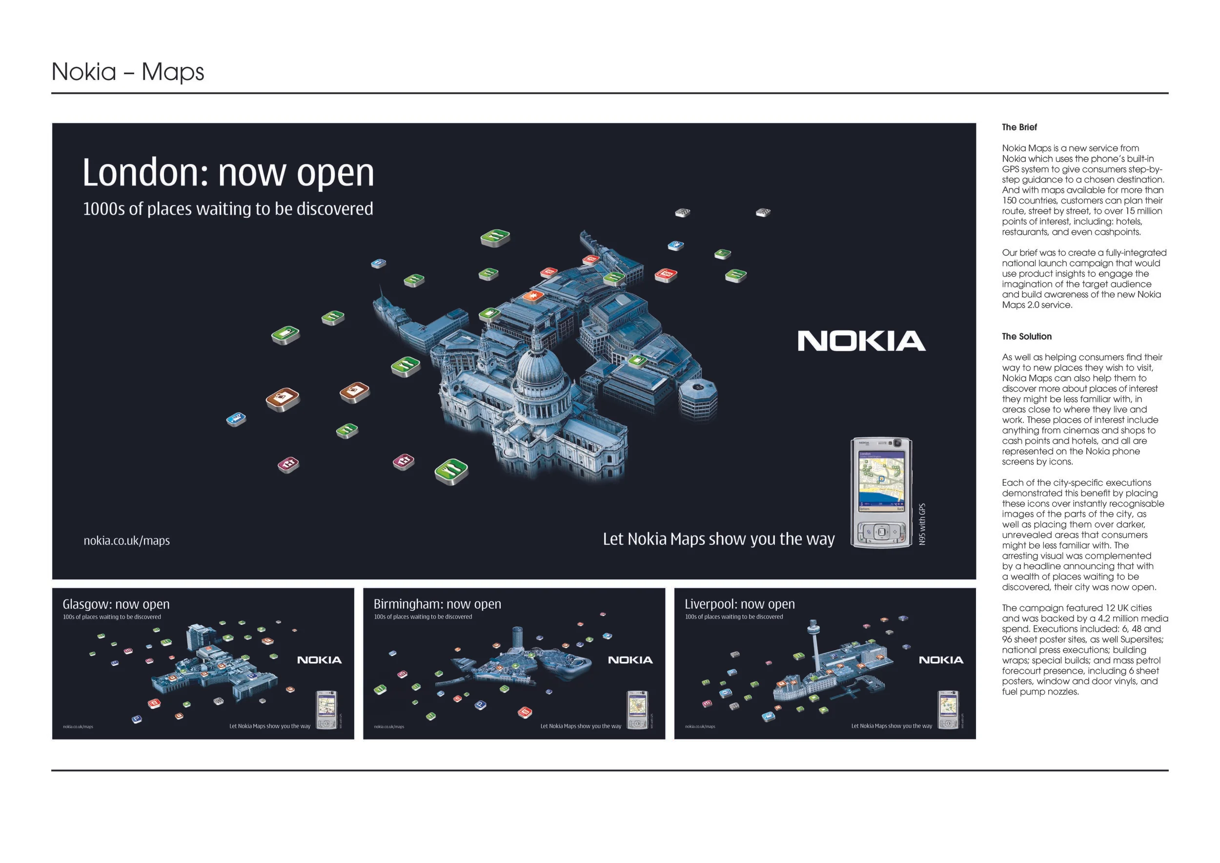 This UK-wide campaign was to launch the new Nokia ‘Maps’ 2.0 Navigation Service. The task (for various reasons) was Herculean. The comms needed to hit 12 major cities with over 100 different specs of communications – all to be conceived, created, produced and implemented within three weeks. Incredibly, it was delivered on time, and the campaign was also very effective. Thank you to our Head of Production, Bill McGeorge. Creatives were Tim Noble and Gem Hagan, Paul Waddup and Dan Colley.